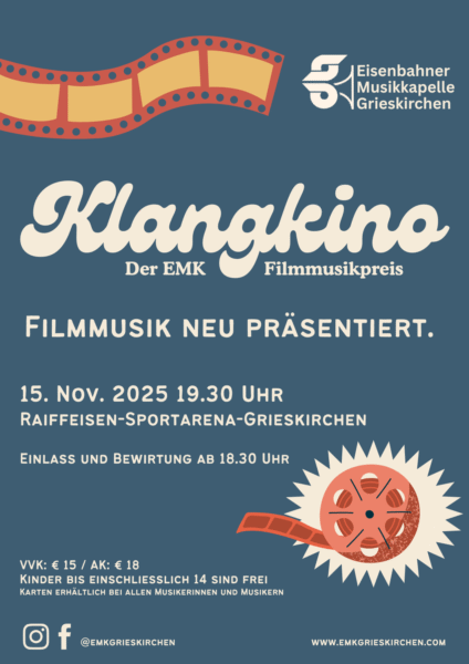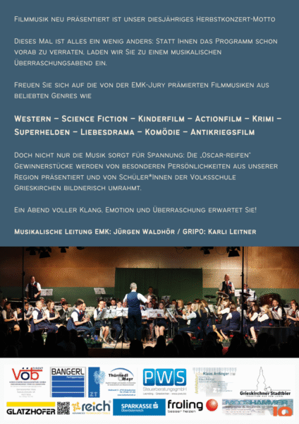 Unter dem Motto “Filmmusik neu präsentiert” lädt die Eisenbahner Musikkapelle Grieskirchen zum diesjährigen Herbstkonzert sehr herzlich ein.